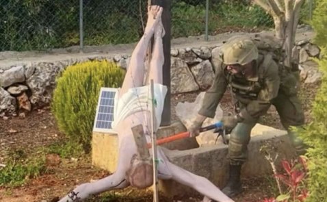 Un soldat vandalise une statue du Christ