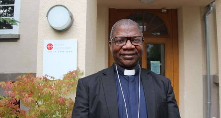 Mgr Mark Nzukwein en 2023, en visite au siège de l’Aide à l’Église en Détresse (AED)